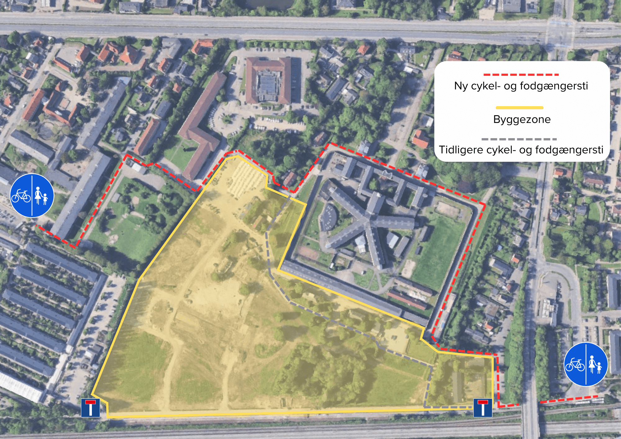 Den nye cykel- og fodgængersti vil styre udenom byggepladsen og rundt om det tidligere statsfængsel Vridsløselille (nord).